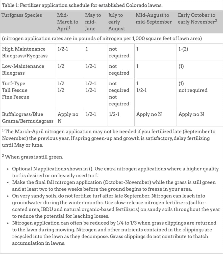 (Fertilizer Application Chart by Colorado State University Turfgrass Extension)