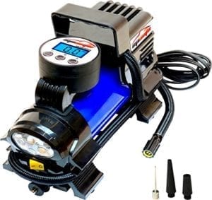 This is a favored air compressor for off-road enthusiasts. It comes with inflation tips and a 5-in-1 inflator/deflator open-ended air hose. This makes it one of the best portable tire inflators on the market.